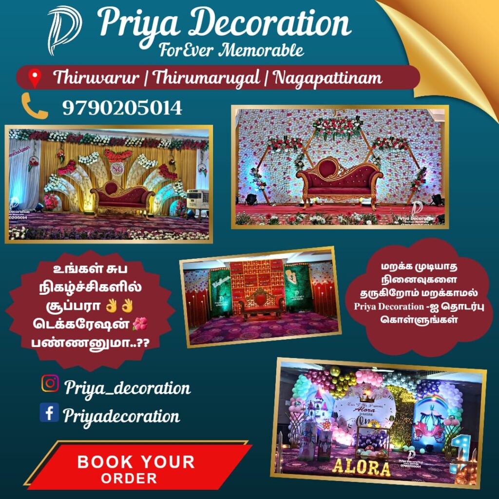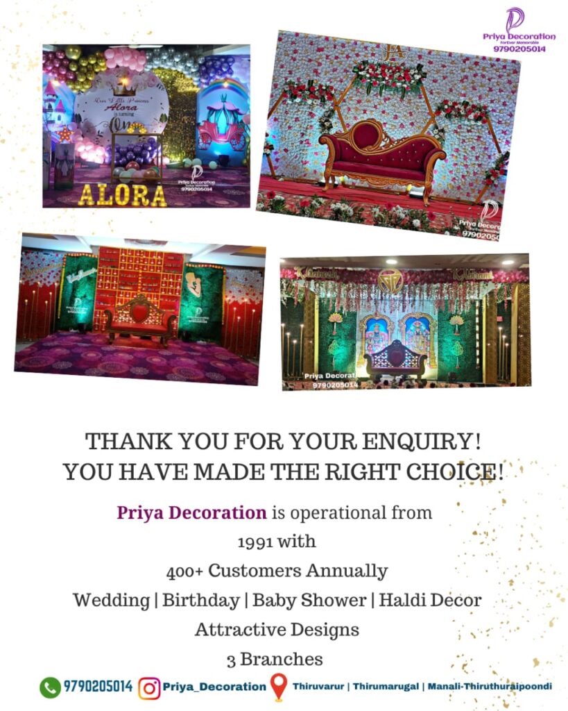 ​Priya Decoration is ready to turn your dream BIRTHDAY decoration into a reality at any of Thiruvarur’s finest halls. TIRUVARUR, TIRUTHURAIPOONDI, THIRUMARUGAL AVAILABLE DECORATION CONTACT